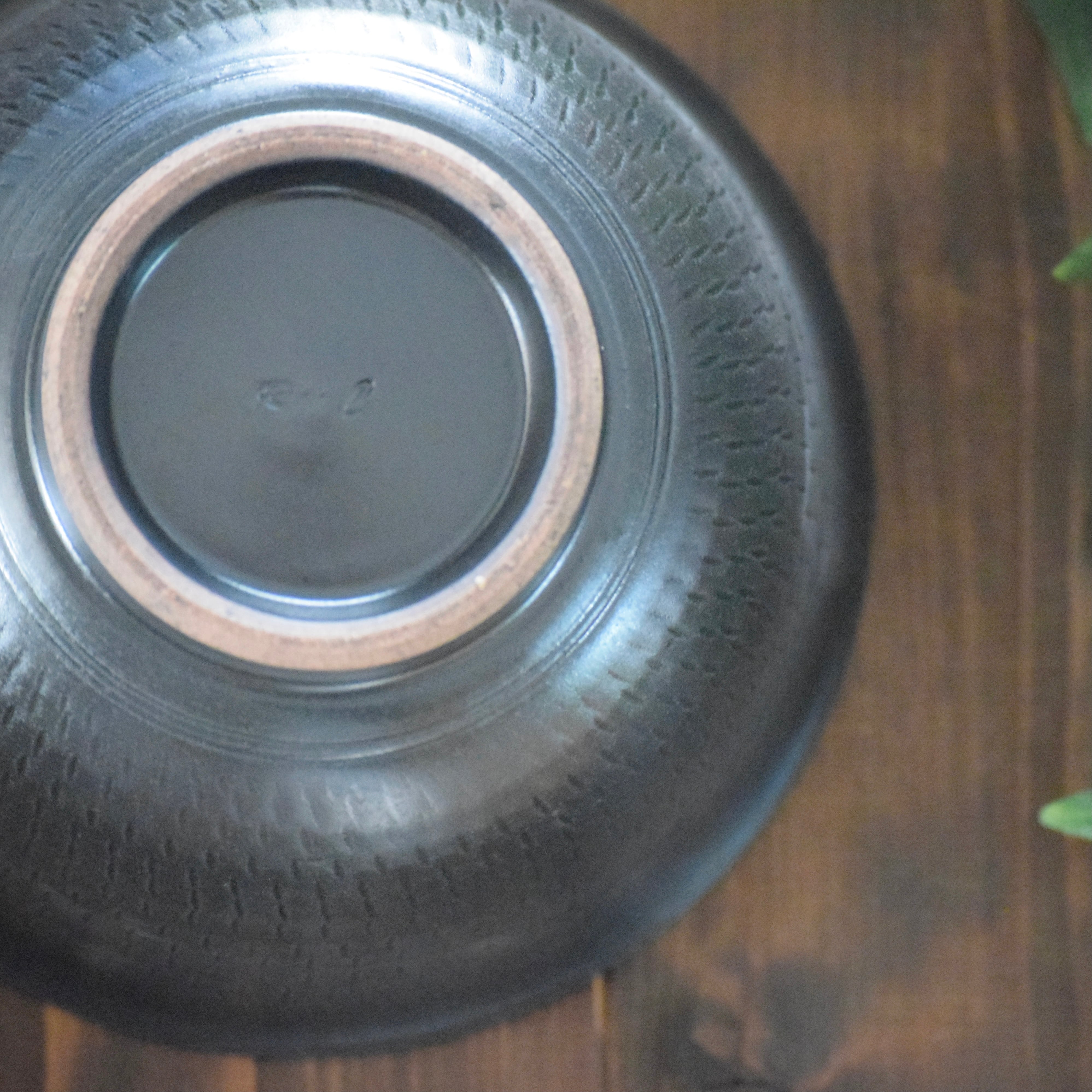 釉薬は鉄を原料とした「黒鉄釉」、柄は小石原焼を代表する「飛鉋(とびがんな)」