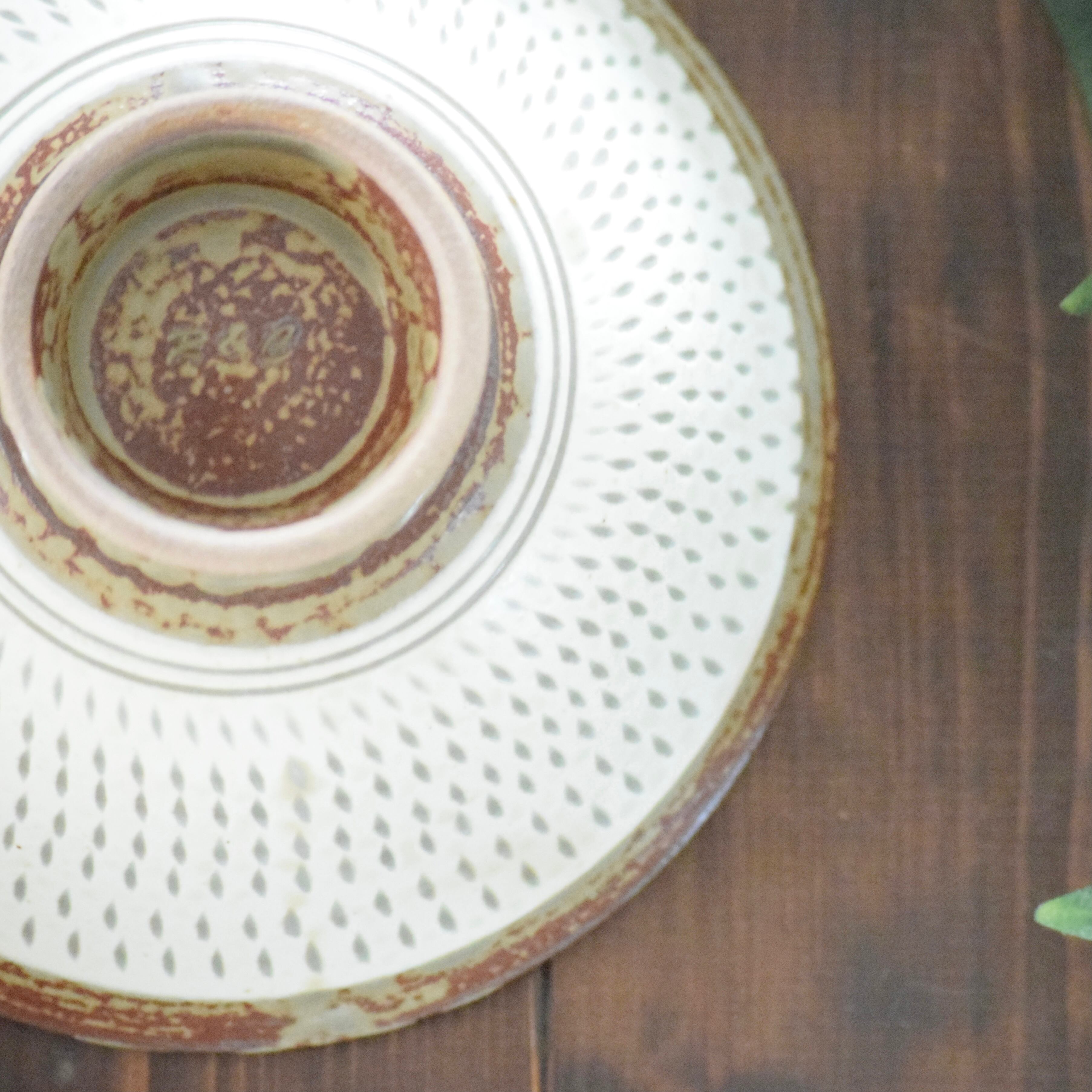釉薬は優しい色合いの「白釉」をベースに、高台と縁の部分に「灰釉」をポイントで使用。柄は小石原焼を代表する「飛鉋(とびがんな)」