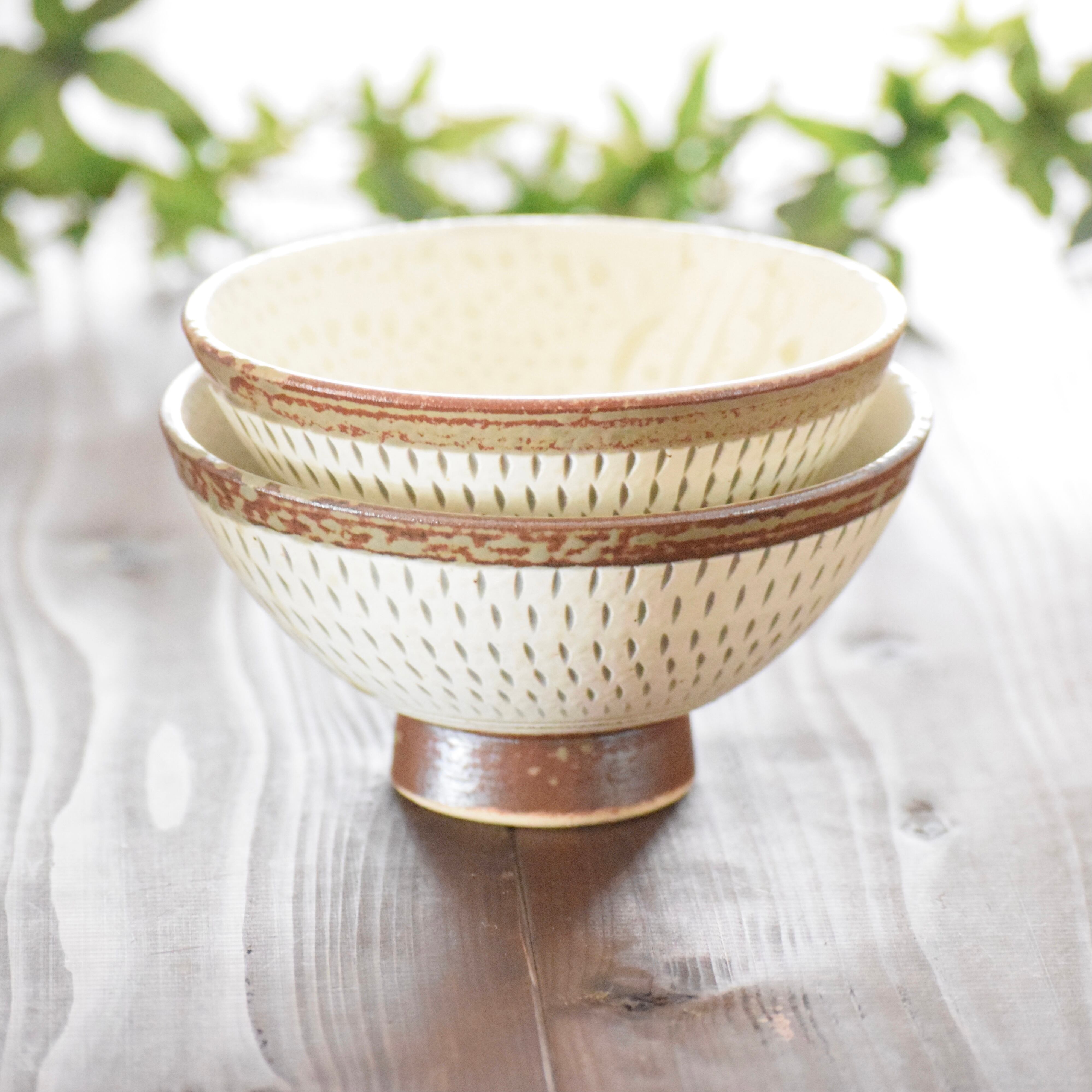 釉薬は優しい色合いの「白釉」をベースに、高台と縁の部分に「灰釉」をポイントで使用。柄は小石原焼を代表する「飛鉋(とびがんな)」