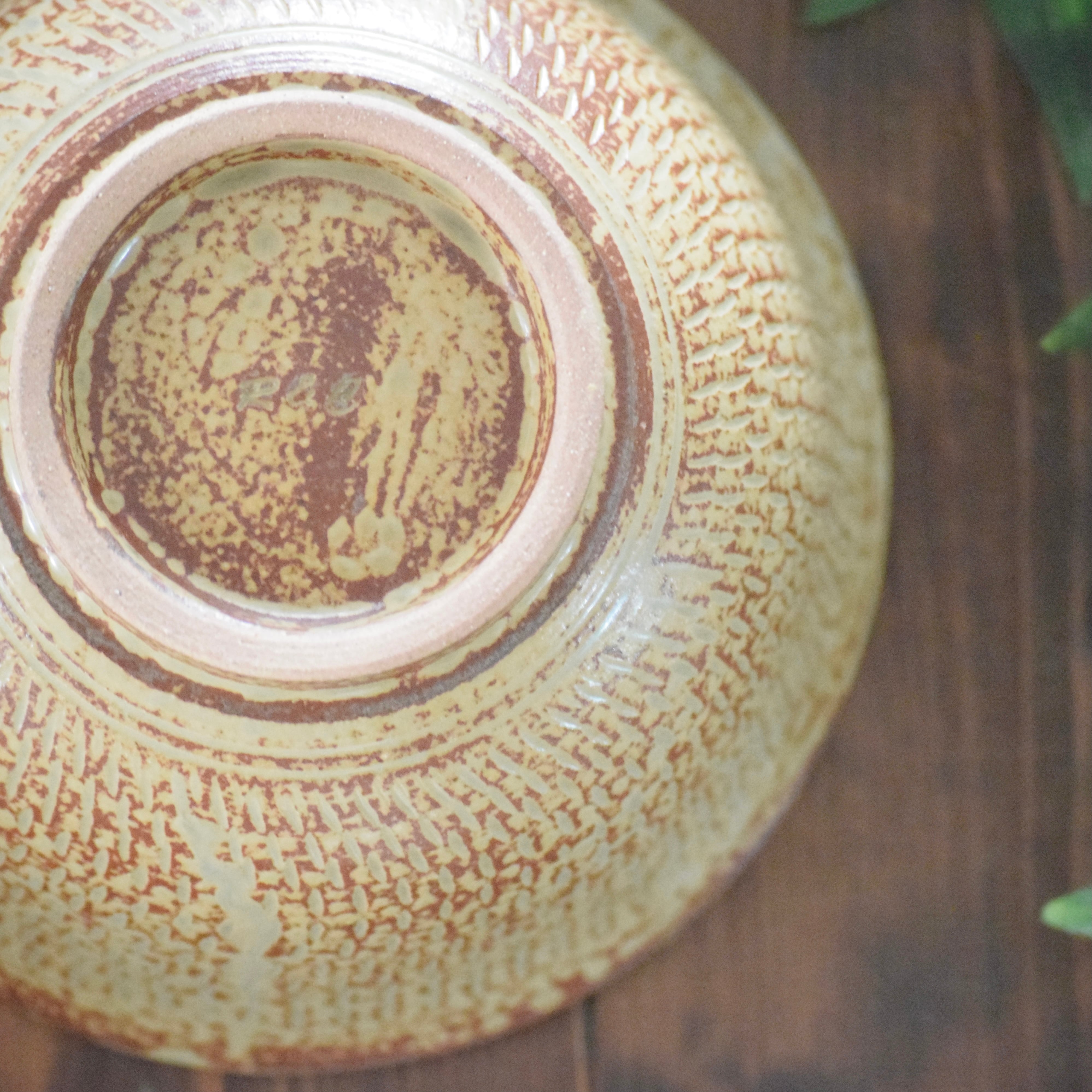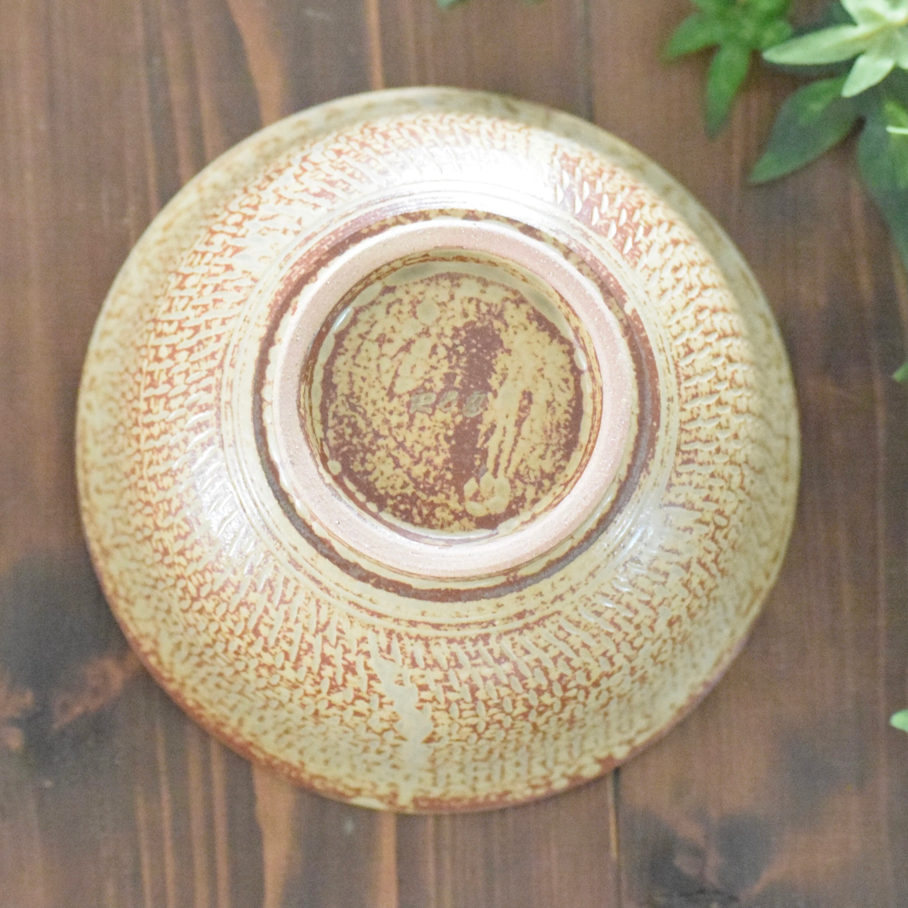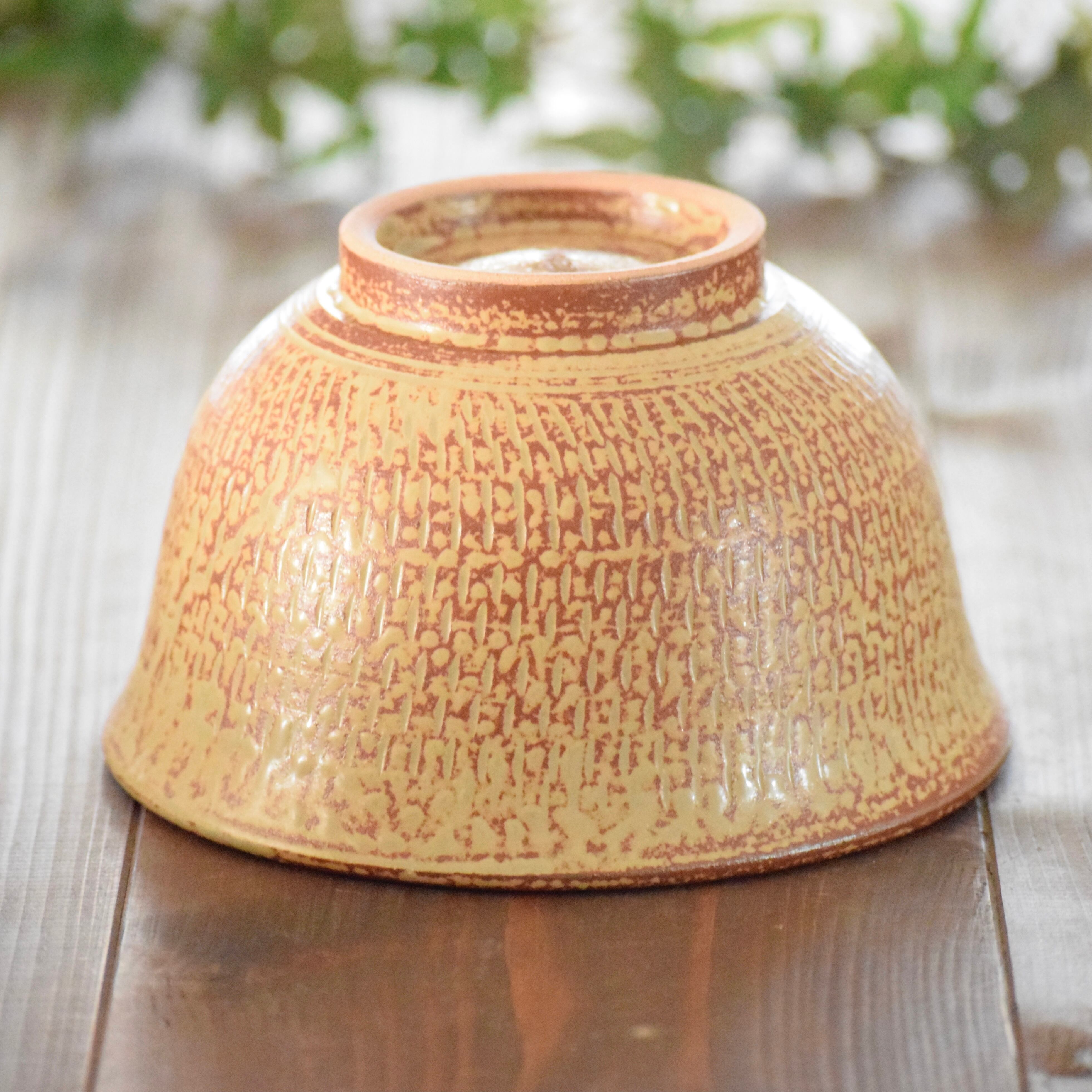釉薬は自宅の薪ストーブから出た木灰を使用した「灰釉」、柄は小石原焼を代表する「飛鉋(とびがんな)」