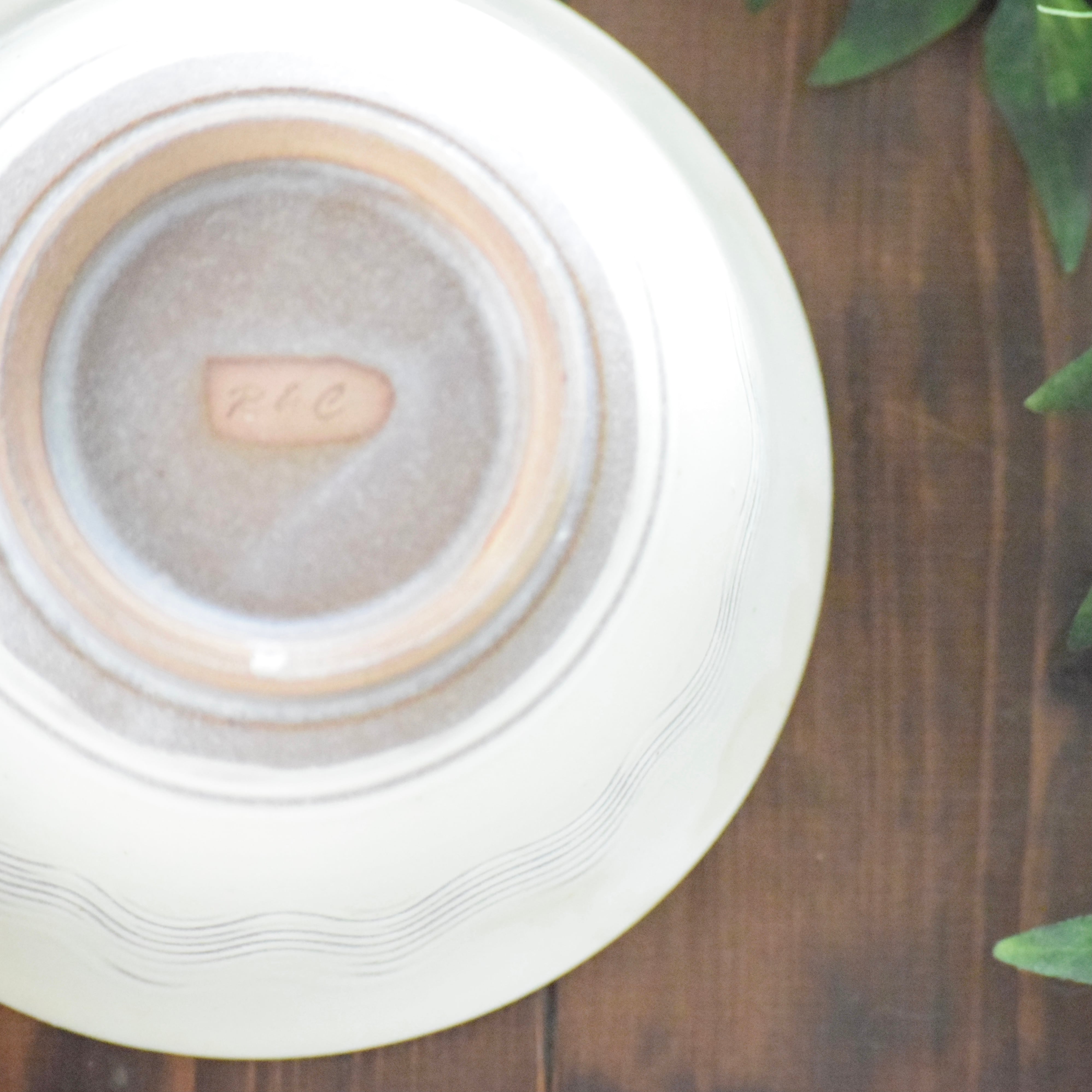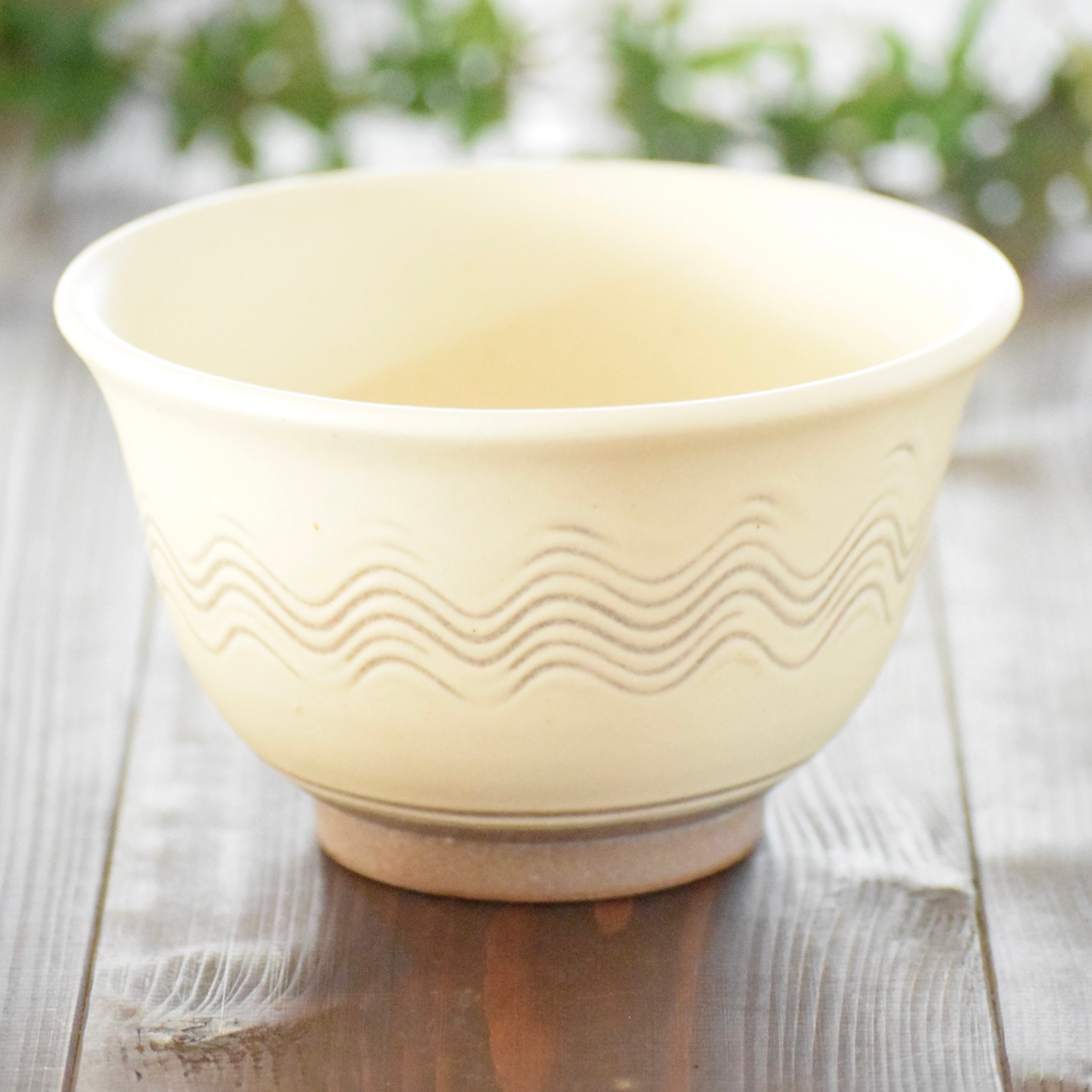釉薬は優しい色合いの「白釉」、柄は小石原焼の伝統技法「櫛目(くしめ)」